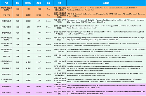 在消化系统肿瘤领域,Stake创新产品相关研究共入选2项口头报告、10项壁报和2项电子壁报,共14项研究。除了明星药物卡瑞利珠单抗和阿帕替尼外,还有5篇阿得贝利单抗治疗消化系统肿瘤的研究入选。此外,HRS-4642、瑞拉芙普-α注射液(SHR-1701)等未上市创新产品也有相应研究入选。随着新老药物前沿研究的不断推进,有望为消化系统肿瘤患者带来新的福音!